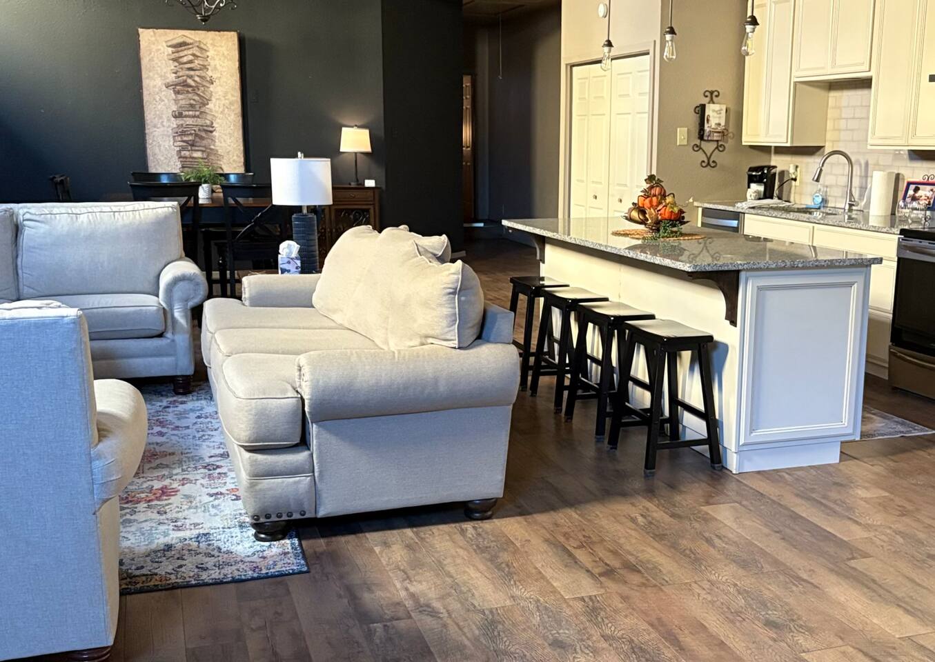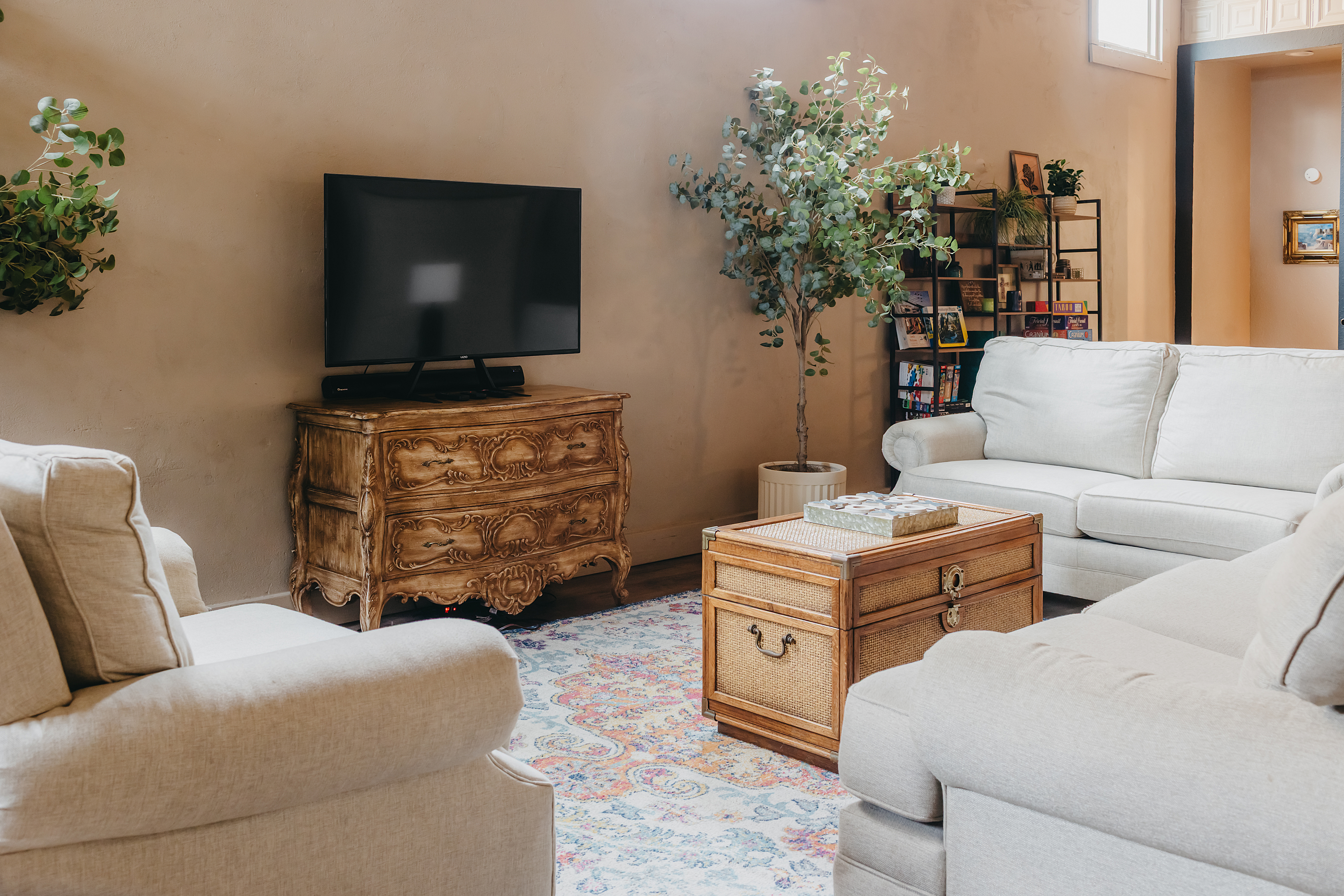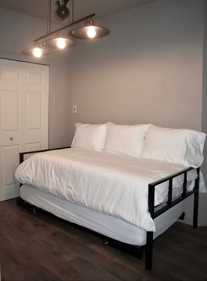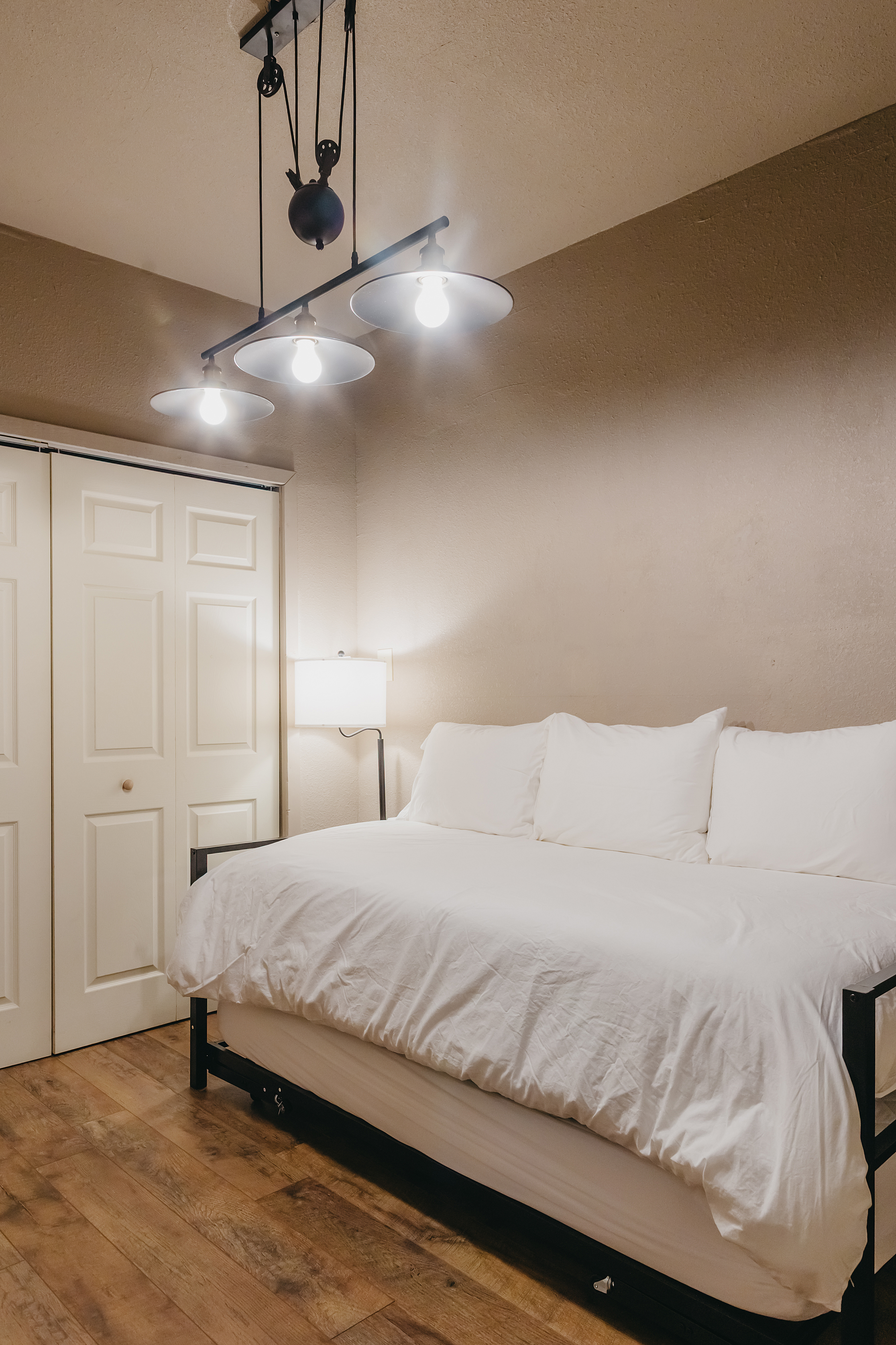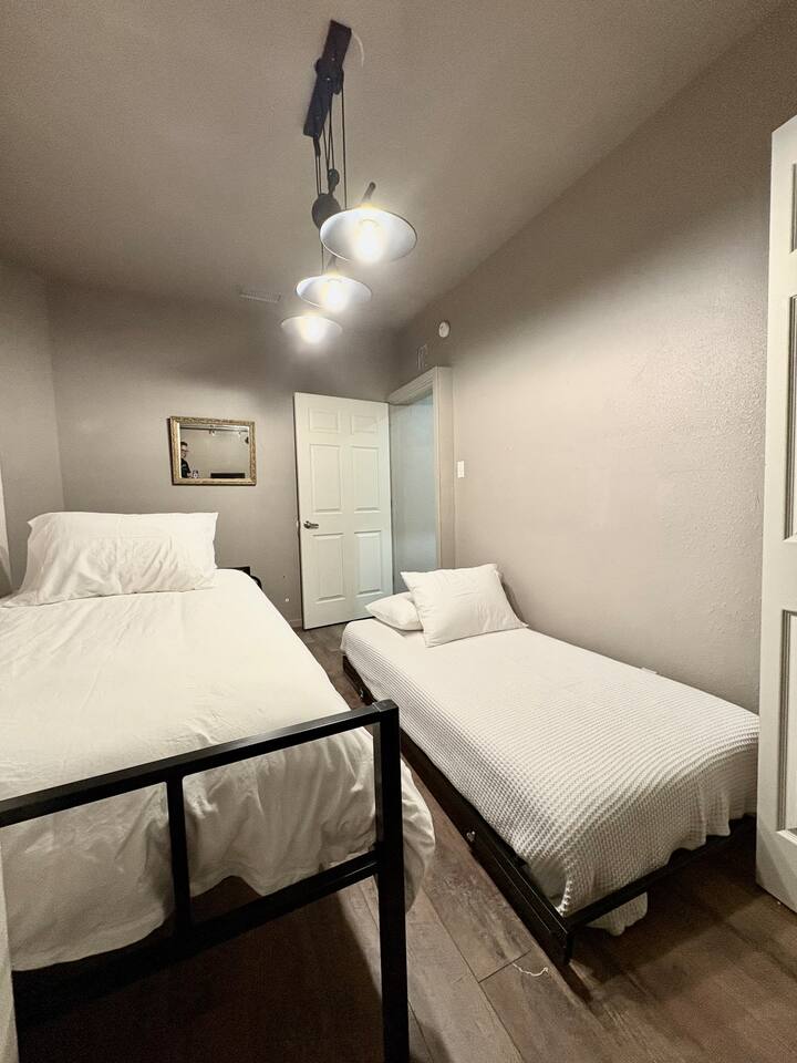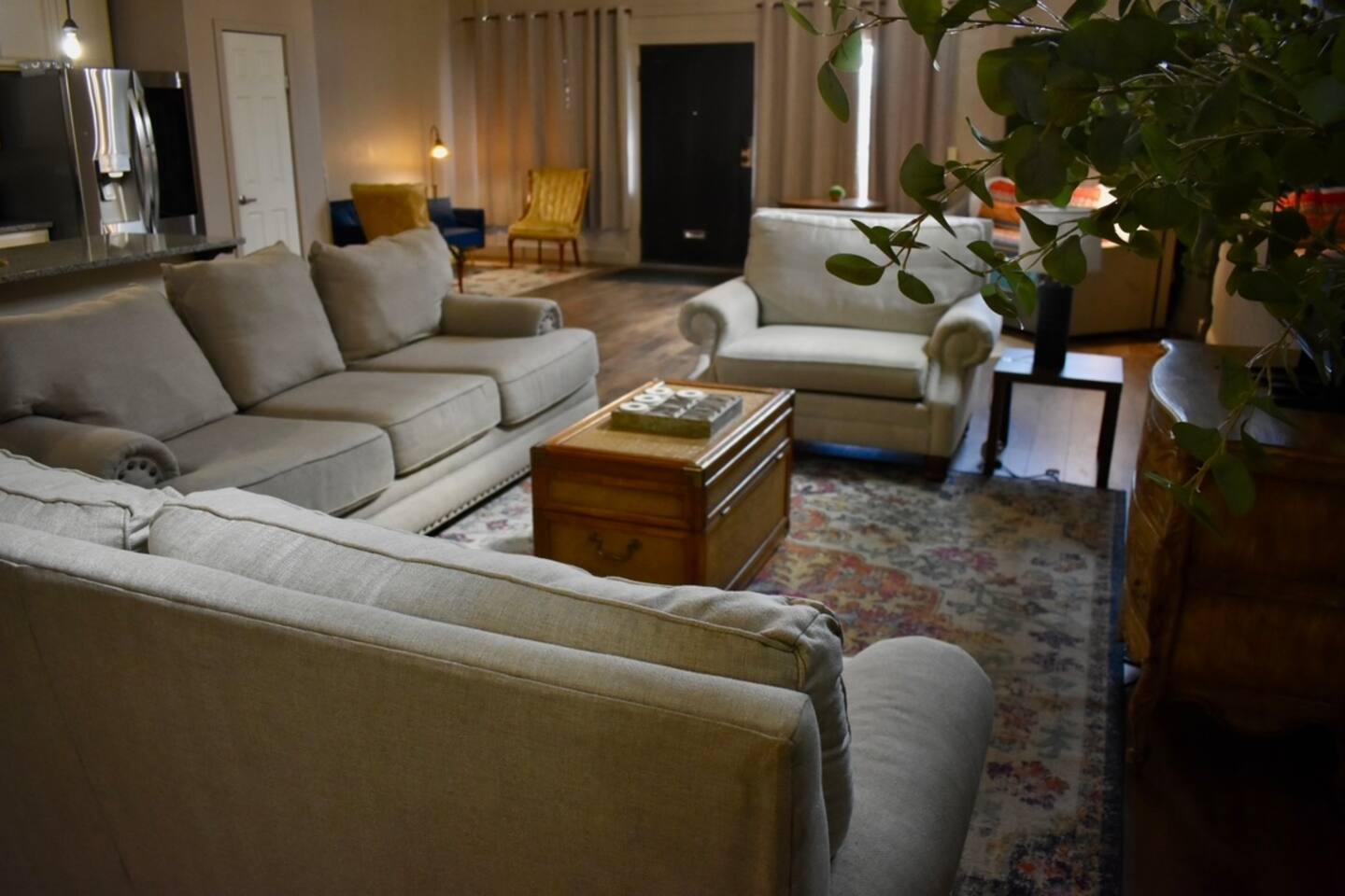 Relax in Style and Comfort Unwind in the chic, spacious living area featuring a plush couch, cozy loveseat, and an oversized armchair perfect for lounging. Enjoy your favorite shows on the Smart TV with high-speed Wi-Fi—ideal for streaming or getting work done remotely. The dining table comfortably seats up to eight, making it the perfect spot for family meals, game nights, or catching up over coffee. A curated collection of board games is provided to add a little extra fun to your stay. Fully Equipped Kitchen Whether you’re preparing a full meal or grabbing a quick bite, the fully stocked kitchen has everything you need: Essential cookware and utensils Dishes, cutlery, and wine glasses Keurig coffee maker with a generous supply of K-Cups, creamer, and sugar Bottle opener and other kitchen essentials Comfortable Sleeping Arrangements The primary bedroom features a plush queen bed, ample closet space, and a nightstand with easy-access charging ports. The second bedroom includes a versatile trundle bed, spacious closet, and a luggage rack—fresh sheets and pillows for the trundle are provided. Need extra sleeping space? The living room offers a stylish daybed with a trundle, comfortably accommodating two additional guests. Fresh linens and pillows are stored in the primary bedroom’s main closet. Please note: There is a 10-inch step up to access the bedrooms and bathrooms. Bathrooms & Essentials Two well-appointed bathrooms come fully stocked with: Toilet paper Body wash Shampoo & conditioner Hand soap Hair dryers Additional Amenities In-unit washer and dryer with detergent Iron and ironing board