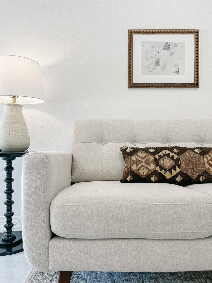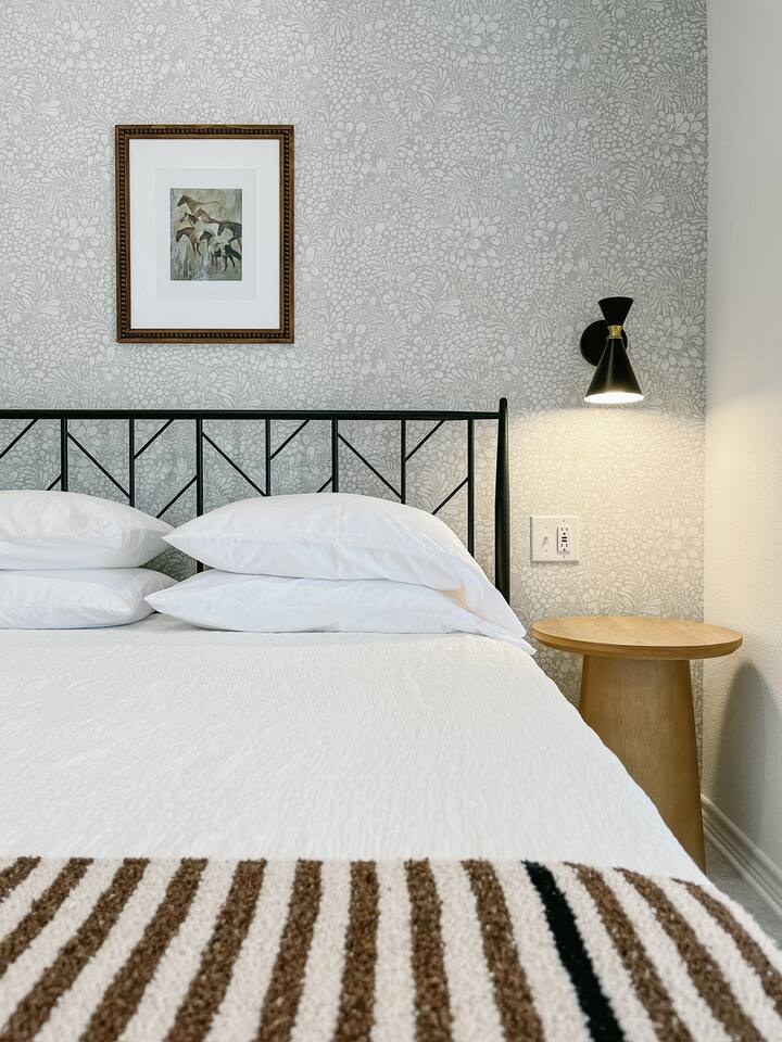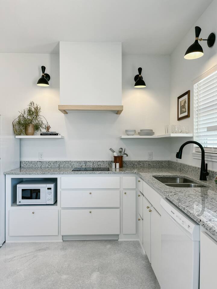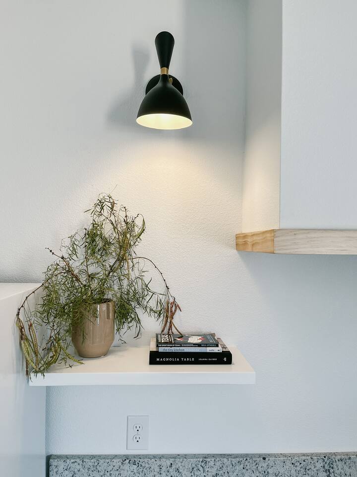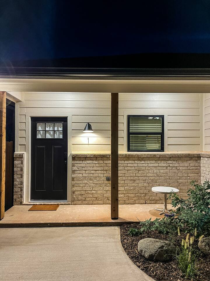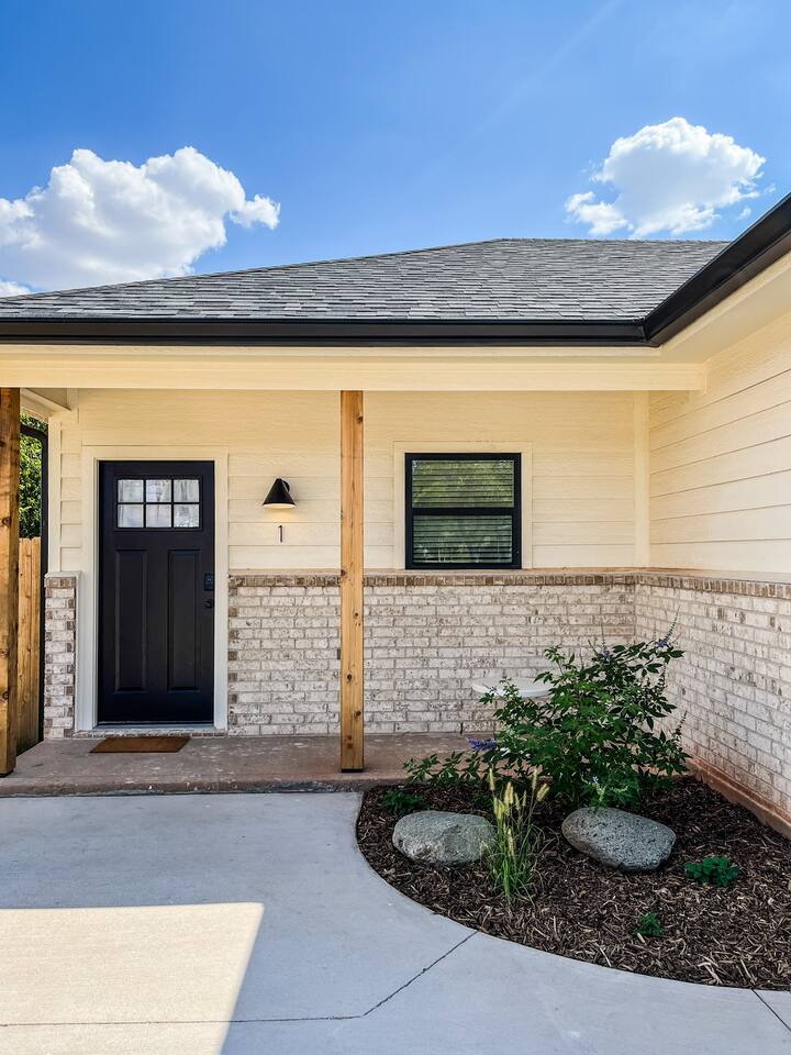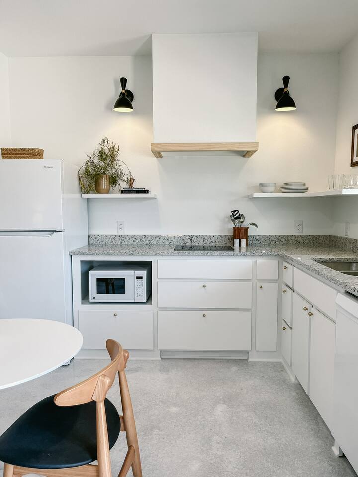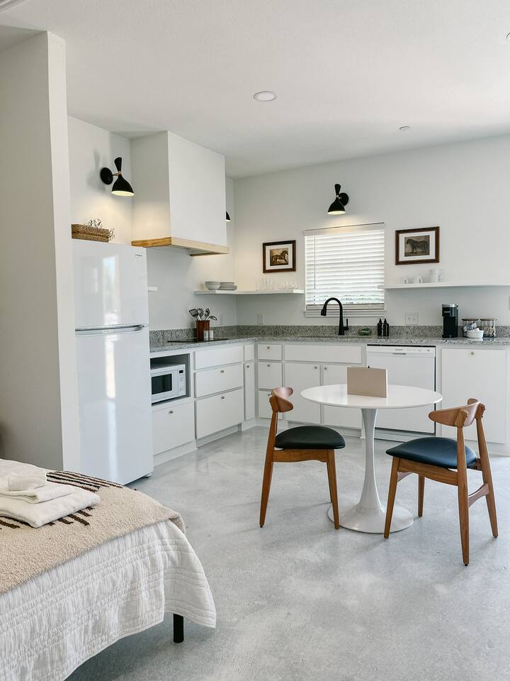 Our mid-century inspired studio is ideal for solo travelers or for couples seeking the most stylish accommodations in Abilene. The space is professionally designed and features polished concrete floors, a queen-sized bed, a modern kitchen with stovetop and coffee provided, dining table, fast wifi, in-suite laundry, 40" TV and loveseat, private back patio, and a sleek bathroom. Moments from ACU, downtown Abilene, Hendrick Hospital, HSU, and more. Thanks for staying with us!