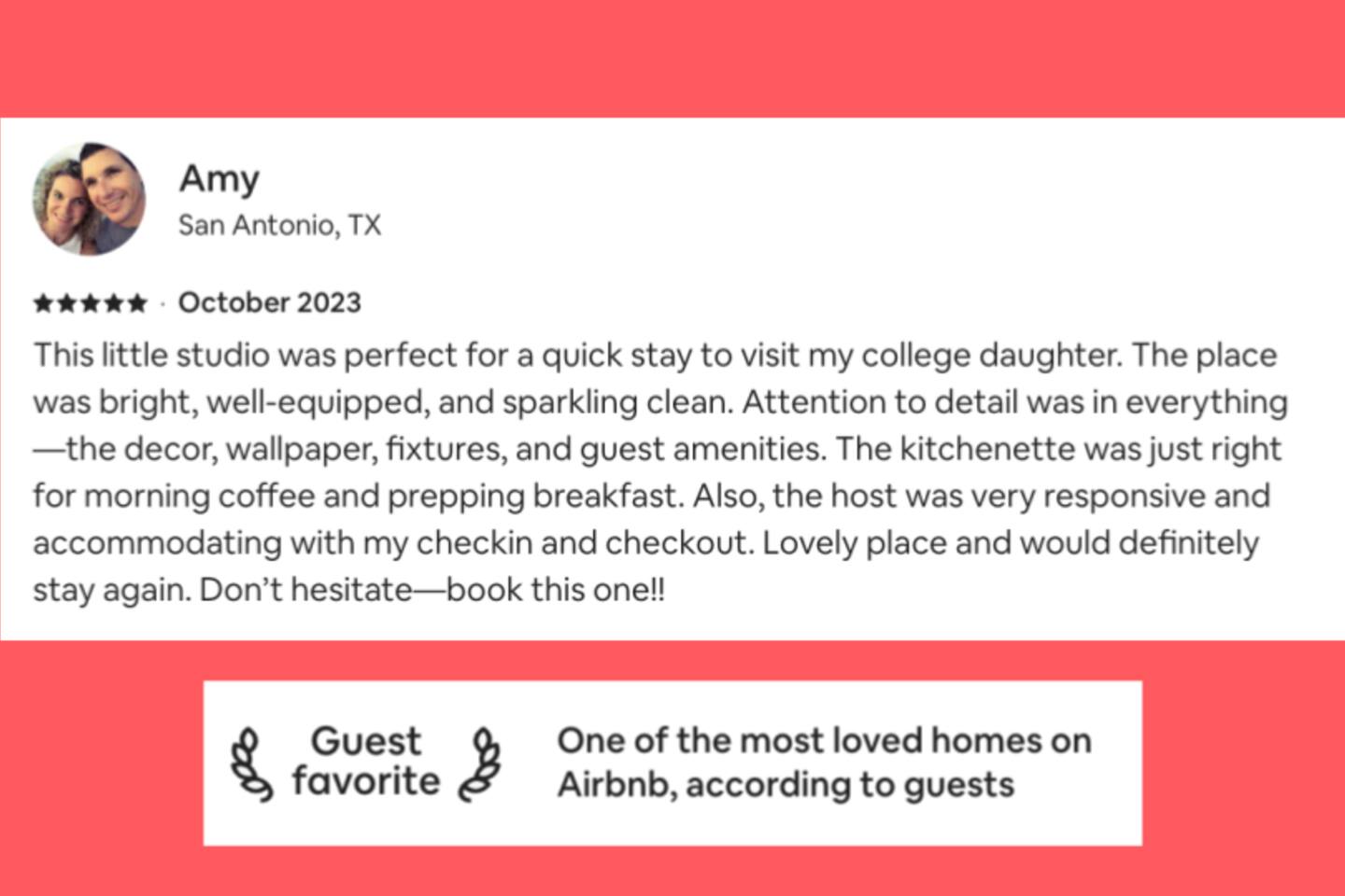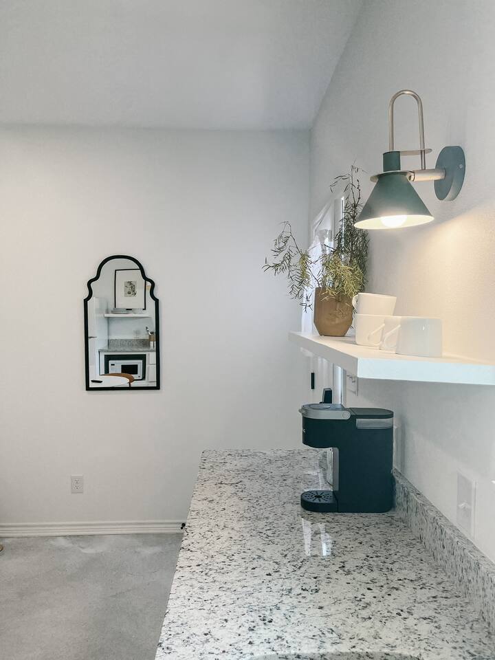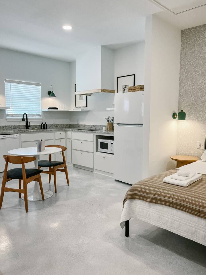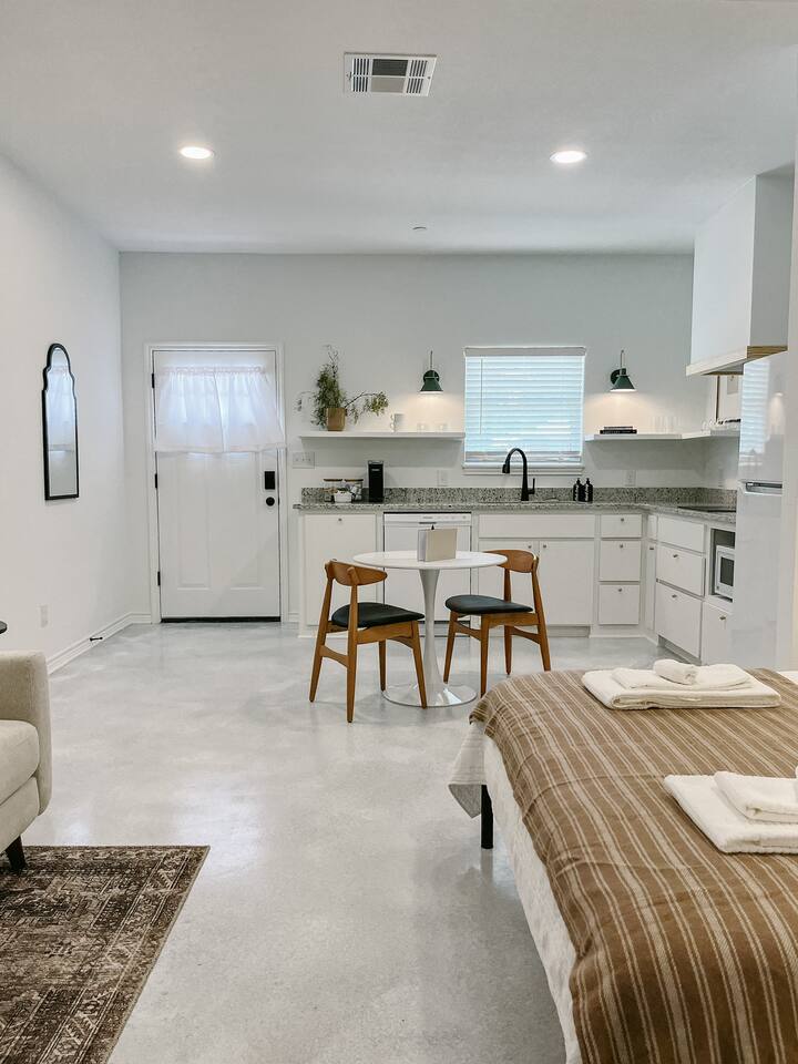 This curated studio is western mid-century inspired and ideal for your time in Abilene. The place is professionally designed and features modern polished concrete floors, a queen-sized bed, a stylish kitchen with stovetop and coffee provided, dining table, fast wifi, in-suite laundry, 40" TV and loveseat, private back patio, and a sleek bathroom. You'll be just moments from ACU, downtown Abilene, Hendrick Hospital, HSU, and more. Thanks for staying with us!
