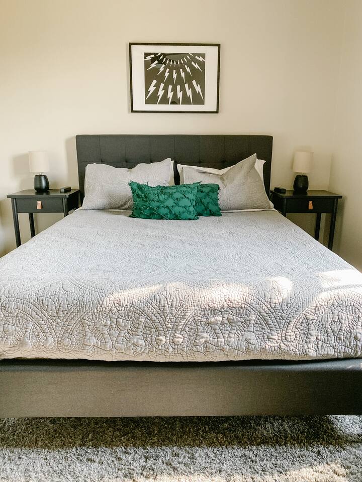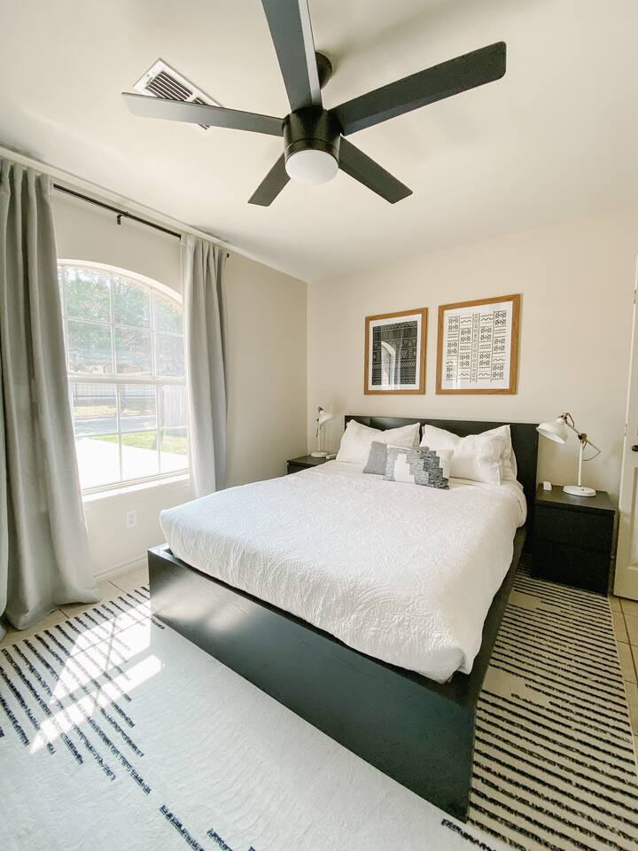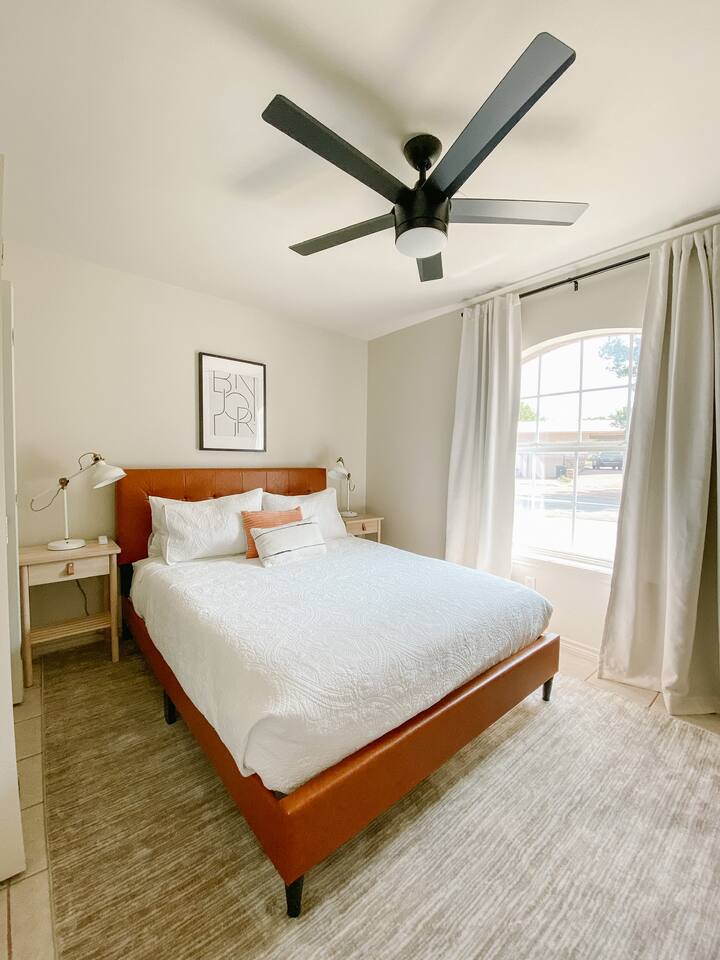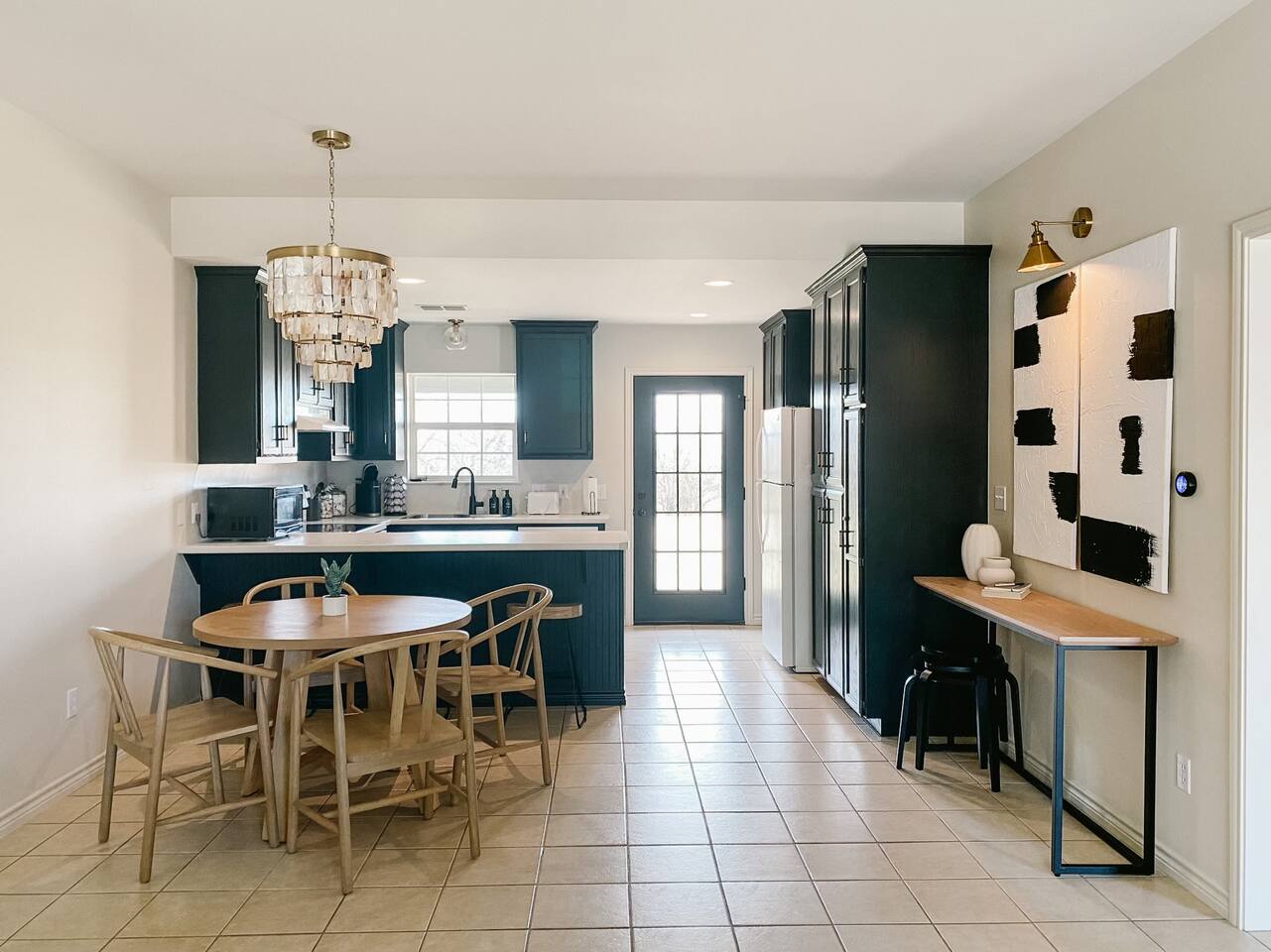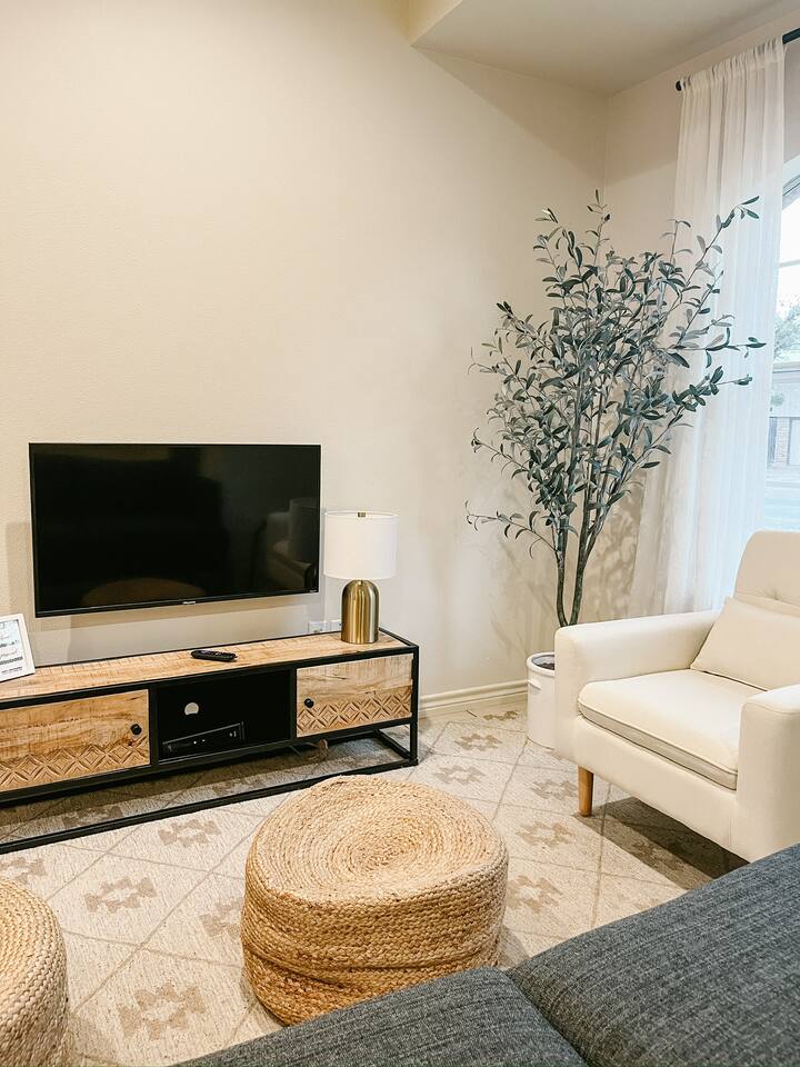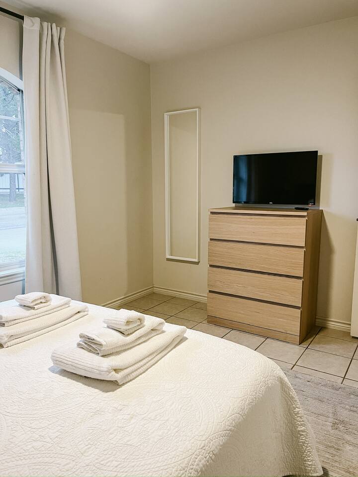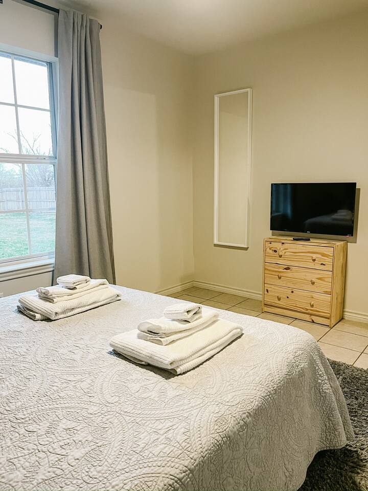 The Ruby offers an open and welcoming living space furnished with a comfortable couch, two seating poufs, a smart TV, and fast WIFI. The kitchen is ready and equipped with the essential cooking utensils you need: cookware, dinnerware, eating utensils, wine glasses and bottle openers. A Keurig coffee maker, coffee pods, cream, and sugar are also provided. The cozy dining area seats 4 at the table, with room for a few more at the bar. Enjoy a home-cooked meal there, or check out our curated Abilene guidebook for restaurant recommendations! There is an in-unit laundry area available to you, including an ironing board and iron for your use. Each bedroom is uniquely decorated and comfortably set with a queen bed, dresser, closet, full length mirror, and night stands to help you feel more at home. Every room is equipped with two USB charging stations as well, just in case you forgot your phone charger. The bathrooms are updated and sparkling clean. We supply extra towels, body wash, shampoo, hand soap, make-up removal wipes, and hair dryers for your convenience-- everything you need to be comfortable. With a large, private backyard The Ruby is a great place to enjoy a West Texas sunset. Whatever brings you to Abilene, thanks for staying with us!